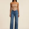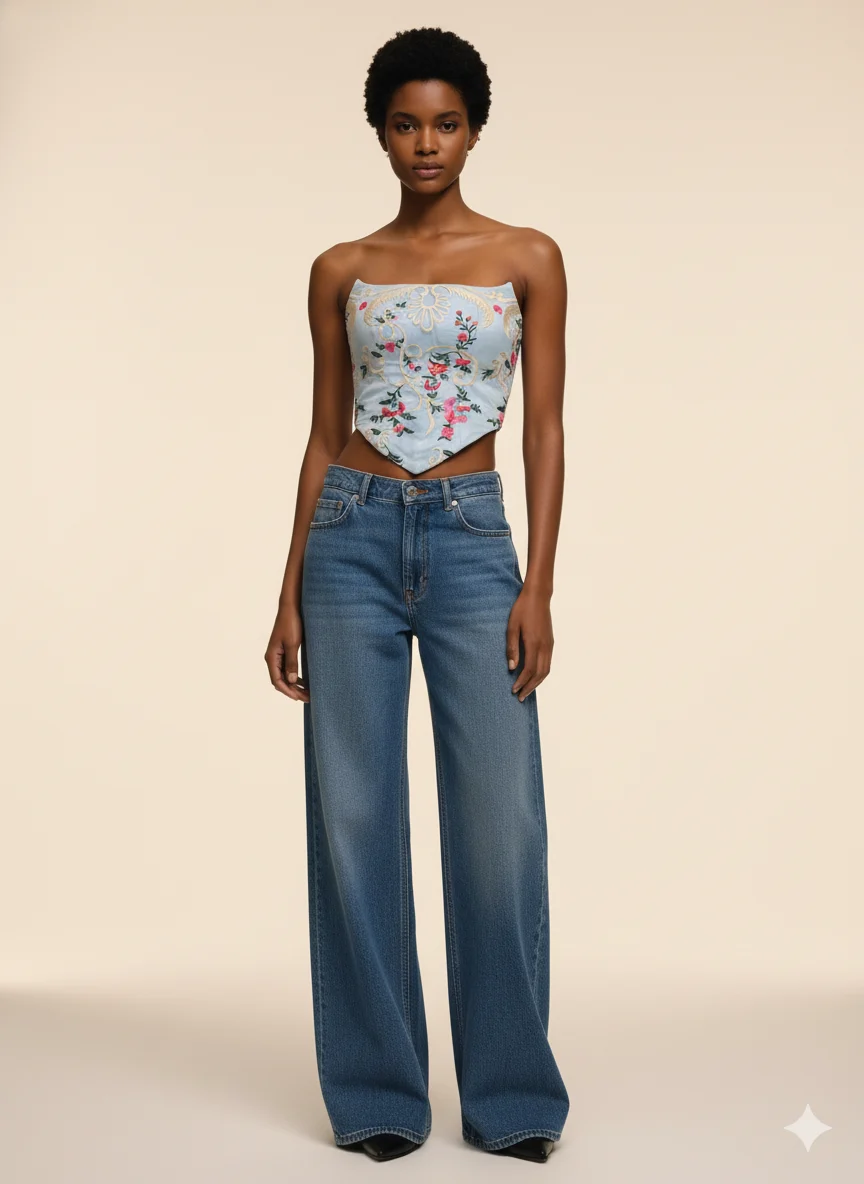 Sky Bloom Corset is a sculpted, strapless statement piece crafted in a soft sky-blue base with delicate floral embroidery. Designed to shape the silhouette with a romantic couture touch, it pairs effortlessly with denim or elevated evening looks