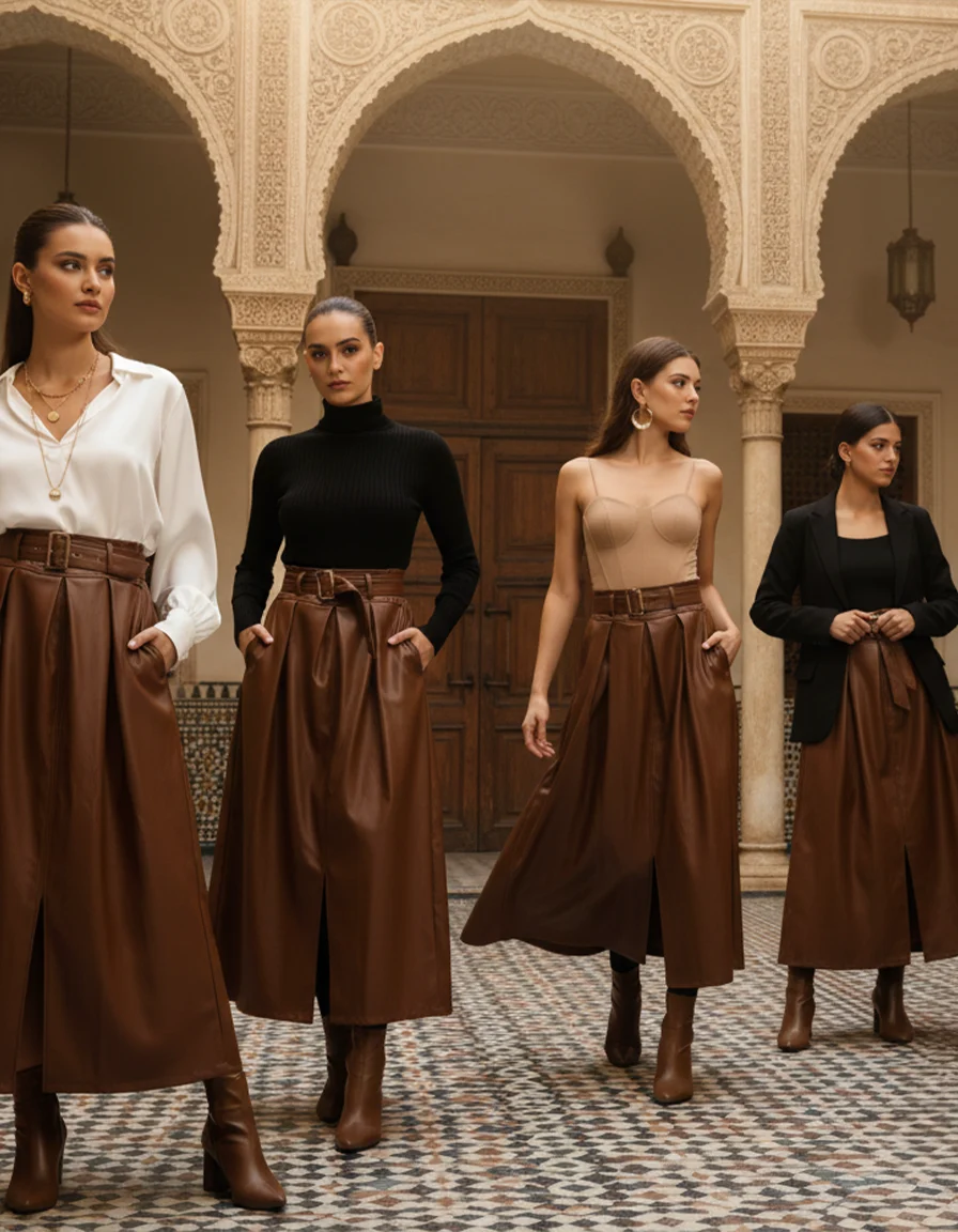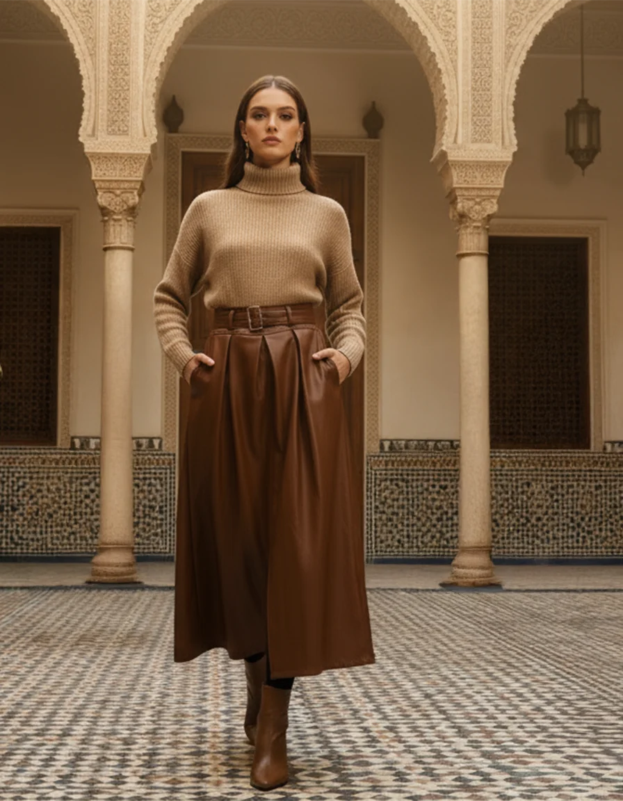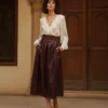 Handcrafted from the finest faux leather, this high-waist skirt features structured pleats, a statement belt, and a subtle front slit that brings freedom and flow to every movement. Its elegant form captures the perfect balance between power and grace — embodying the Vivica woman: confident, sophisticated, and unstoppable.